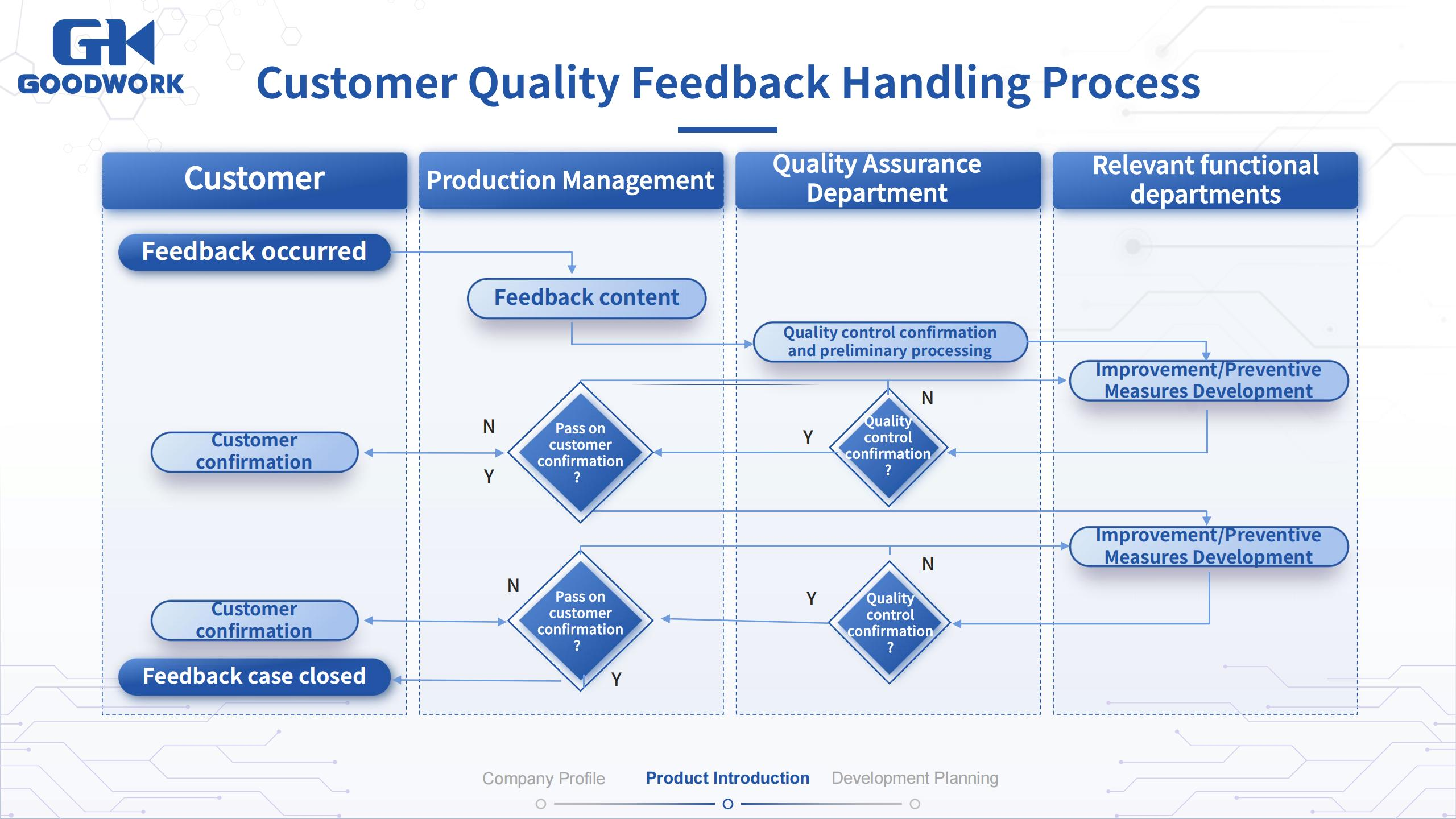 - This flowchart illustrates the comprehensive process from the occurrence of customer feedback to the closure of the feedback case, highlighting the collaboration between Production Management, the Quality Assurance Department, and relevant functional departments.
